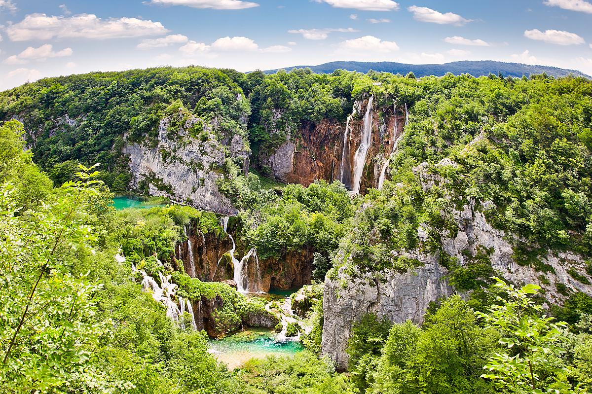 NP Plitvické jazerá je najstarší, najväčší a najnavštevovanejší národný park Chorvátska. Tvorí ho 140 vodopádov (s prevýšením 156 metrov, najvyššia meria 78 metrov), 20 jaskýň a 16 jazier napájaných päticou riek (Biela, Crna, Korana, Plitvica a Rječica). Celková rozloha vodných plôch je 217 hektárov.