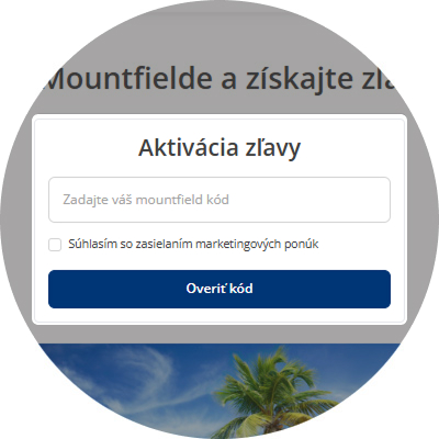Po prihlásení sa zobrazí pole na zadanie zľavového kódu z Mountfieldu. Vložte ho, potvrďte súhlas so zasielaním marketingových správ a kliknite na „Overiť kód“.